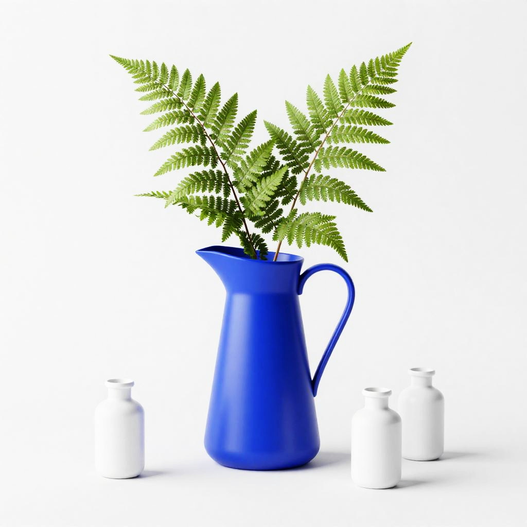 A smooth airbrushed digital art featuring a sleek cobalt blue ceramic pitcher holding a short stem with lush green ferns, on a seamless white background with three small empty white bottles nearby; high contrast, bold accent colors, thin clean lines, balanced composition, generous negative space, soft studio lighting, modern minimalist aesthetic, crisp edges, no text, no watermark