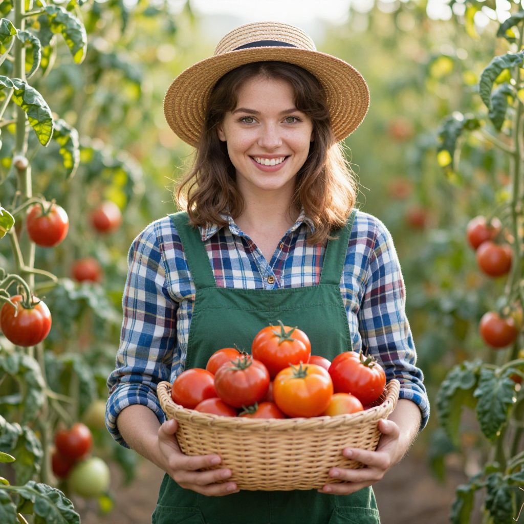 Photograph of a smiling young woman standing in a lush tomato field. She's wearing a straw hat, plaid shirt, and green overalls. She holds a wicker basket filled with vibrant red and orange tomatoes. The background is blurred greenery, giving a sense of depth. Sunlight filters through the leaves, highlighting her happy expression and the fresh produce.