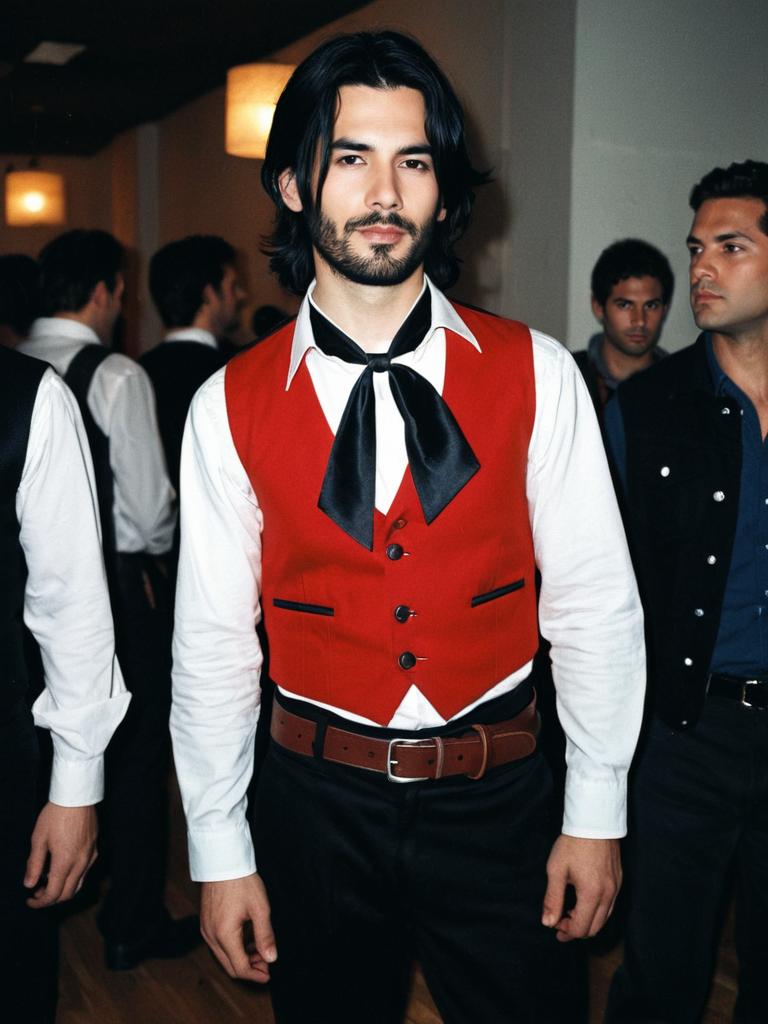 Male costume party, 1boy, male focus, solo, white shirt, pants, shirt, red vest, long sleeves, black hair, standing, black pants, belt, vest, neck ribbon, black ribbon, closed mouth, looking at viewer, facial hair