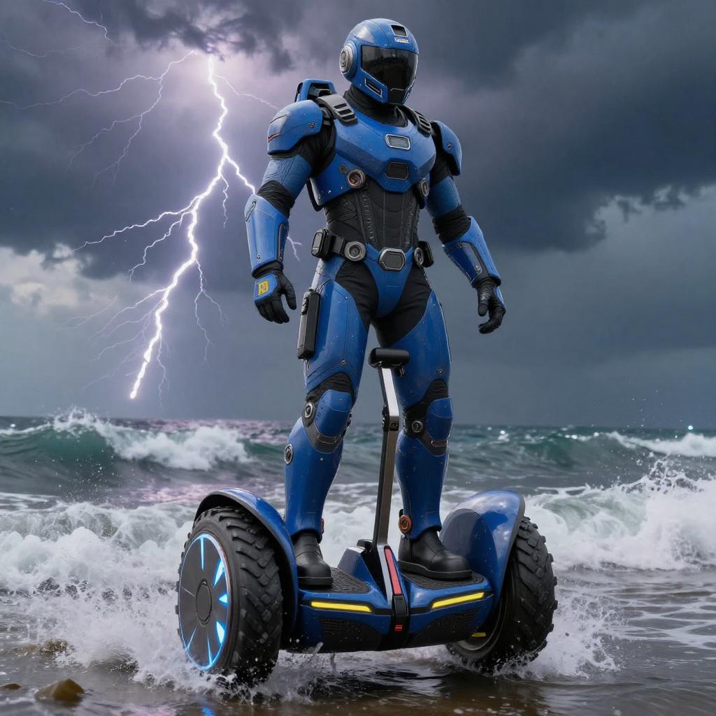 A futuristic figure in advanced blue and black armor with a helmet is riding a high-tech hover Segway over turbulent ocean waves during a storm, with lightning illuminating the dark sky. The rider is equipped with protective gloves and the Segway features large, rugged tires with glowing blue and yellow accents.