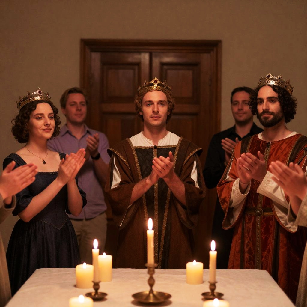 Five people in Renaissance-style attire with ornate crowns, standing around a table with many lit candles. All clapping hands, some with fingers spread. Two women in dark dresses, two men in brown and orange robes, one woman in lavender shirt. Warm indoor lighting, wooden door in background. Candles casting soft glow.