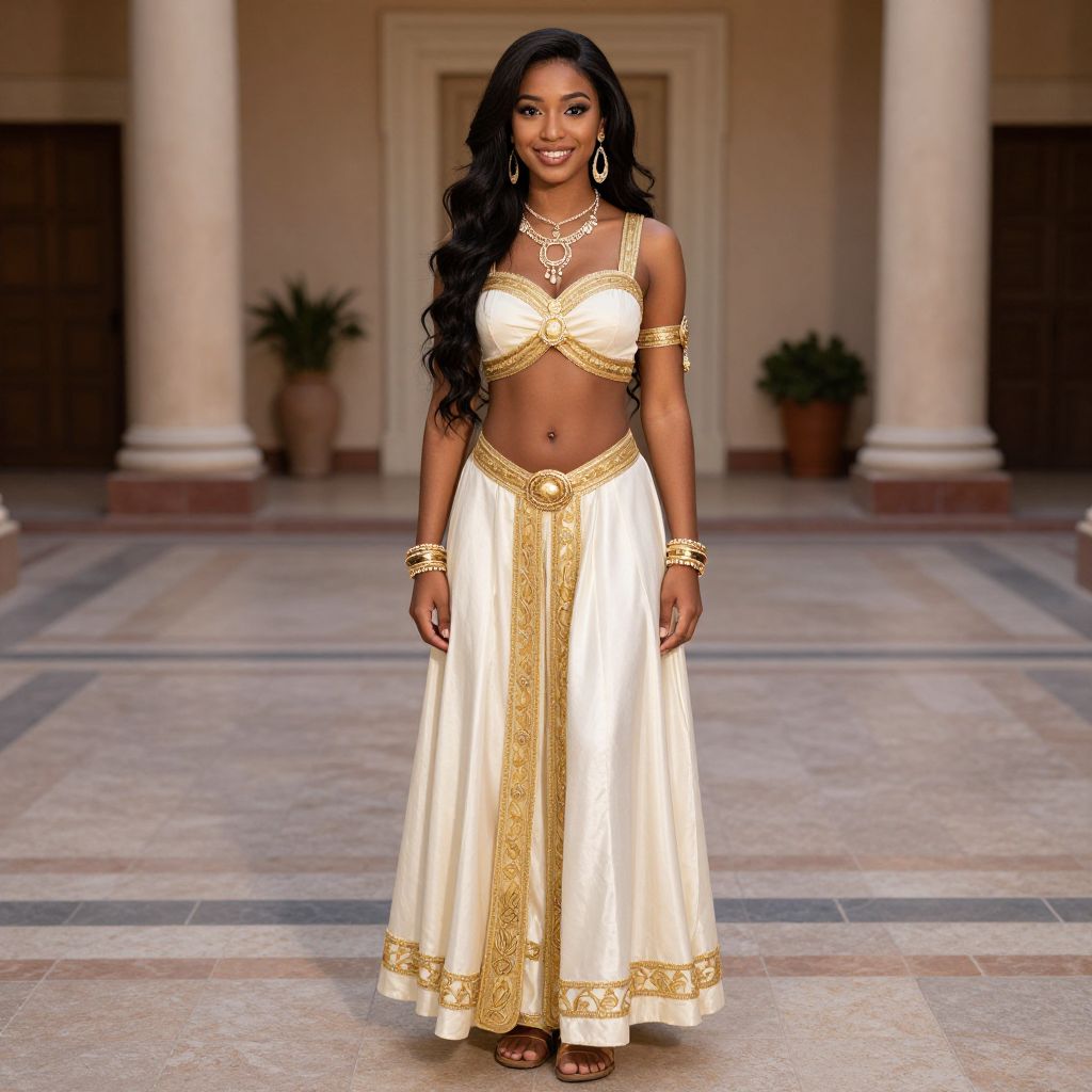 Photograph of a beautiful Black woman with long, wavy black hair, standing in a grand, tiled hall with beige columns. She wears a white, gold-embroidered, traditional Indian outfit featuring a strappy, gold-accented bralette and a flowing, long skirt with a central gold embellishment. She accessorizes with gold arm bands, a necklace, and earrings. Her skin is a rich, dark brown, and she smiles warmly at the camera. The background includes potted plants and a large doorway. The image has a soft, warm light, highlighting the elegance of her attire and the setting.