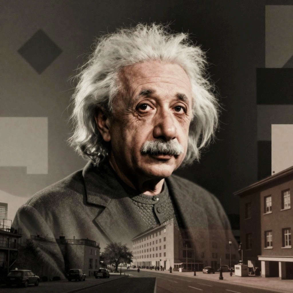 Realistic photo.scientist Albert Einstein, in a Metropolis 1927-inspired collage made of flat double exposure pictures, with a hyper-muted TMAX 3200 color scheme, modernist photographic collage style, rule of thirds composition, and cinematographic mood inspired by Fritz Lang. realistic photo