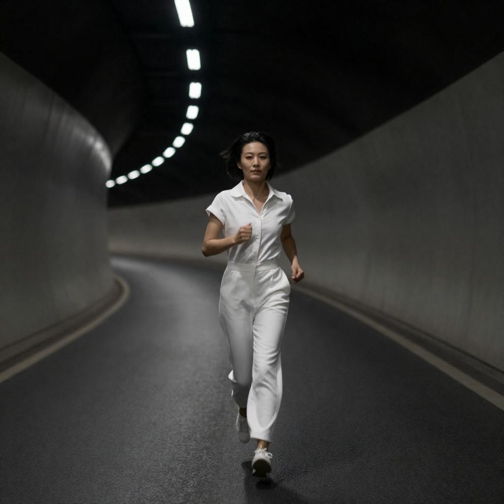 Photograph of a woman in a white jumpsuit running through a dark, curved tunnel with glowing white lights lining the walls. She has short dark hair and is centered in the frame, moving towards the camera. The tunnel's smooth, metallic ure contrasts with her crisp outfit.