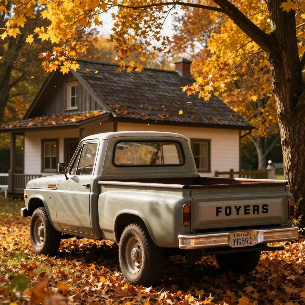 Byers vintage truck parked by a rustic cabin, autumn setting, golden leaves falling, warm sunlight filtering through trees, peaceful countryside vibe, hyper-realistic textures, serene environment