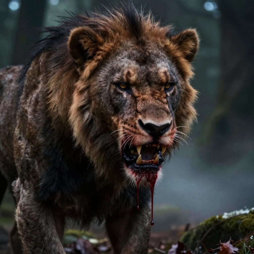 Gnoll blood dripping from sharp claws, dark forest background, eerie mist, close-up on savage beast, vivid red contrasting with dull fur, high detail, dramatic lighting