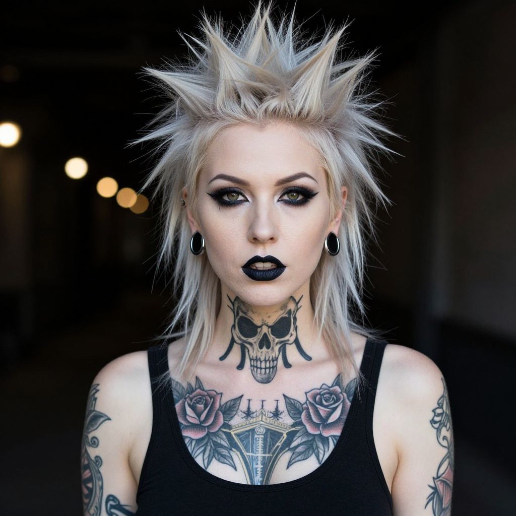Photograph of a punk-inspired woman with pale skin and platinum blonde, spiky hair. She has heavy black eyeliner, dark lipstick, and wears large black ear gauges. Her upper body is covered in intricate black tattoos, including a skull on her throat and roses on her chest. She's wearing a black tank top against a dark, softly lit background with blurred yellow lights.