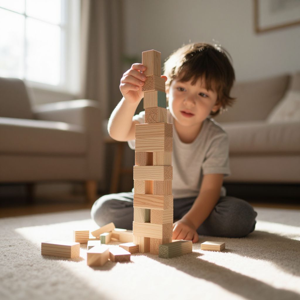 Photo prompt for kids: a child building a tower with blocks in a sunlit living room, sunlight streaming through the window, soft shadows, detailed textures, warm colors, cozy home environment, playful and imaginative moment.