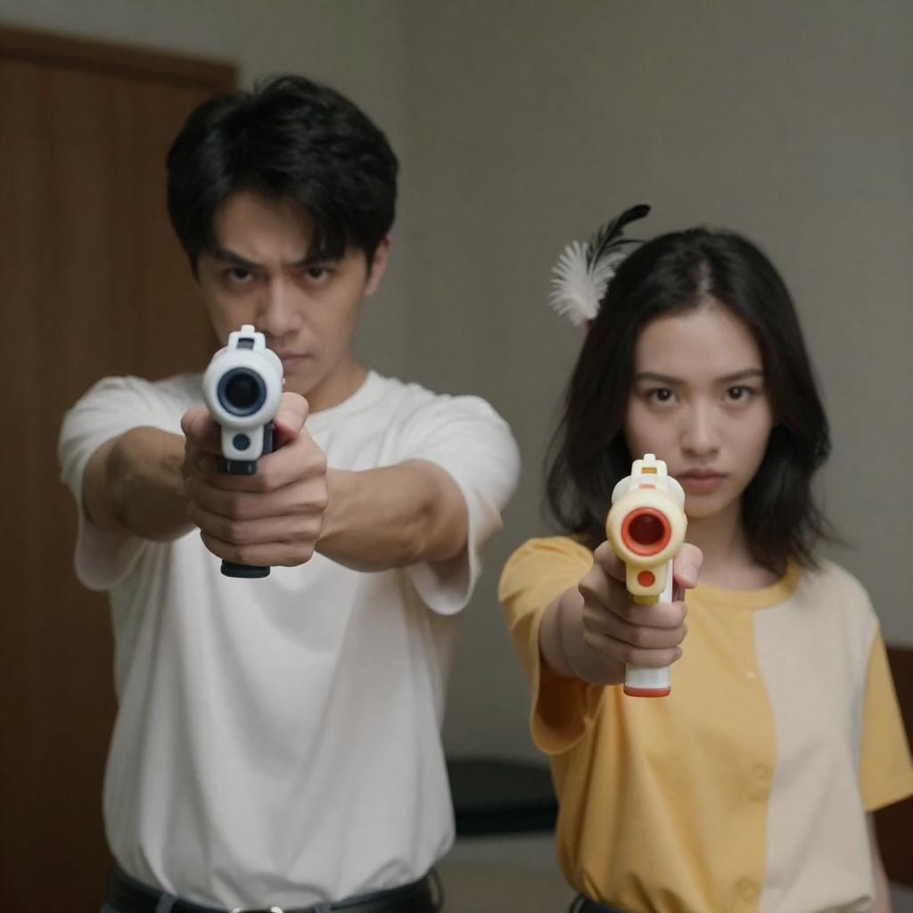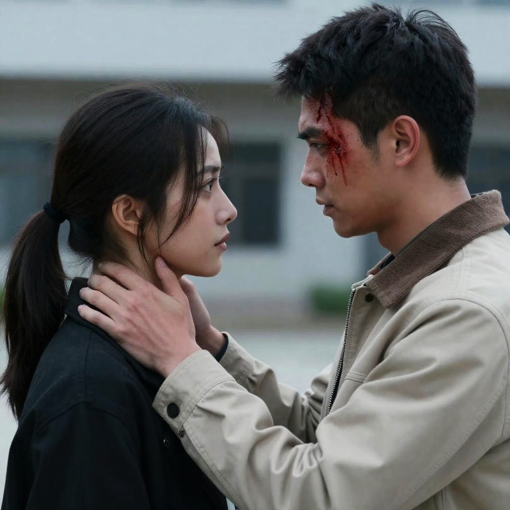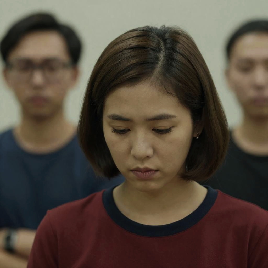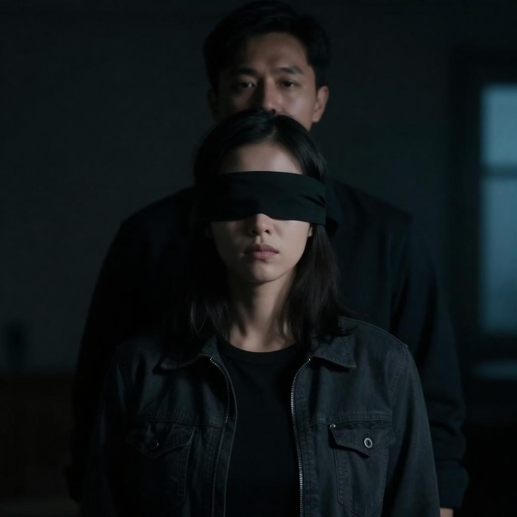 A photograph of a dimly lit scene featuring a man and woman. The man stands behind the woman, his face partially obscured by shadows. The woman wears a blindfold and a dark jacket, her expression serious. The background is dark with a faint blue light on the right. The man's presence is protective, his head close to hers.