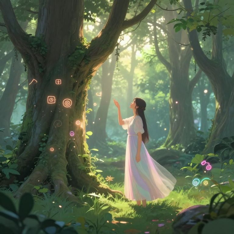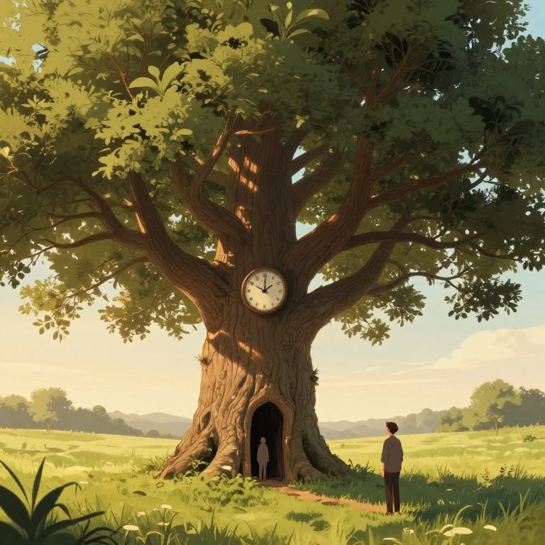 A surreal digital illustration depicts a massive, gnarled tree with a clock embedded in its trunk, standing tall in a serene meadow where two figures—one near the entrance of a hollowed-out tree trunk and another standing outside—seem to observe each other under the soft glow of golden-hour lighting, evoking a whimsical and timeless atmosphere.