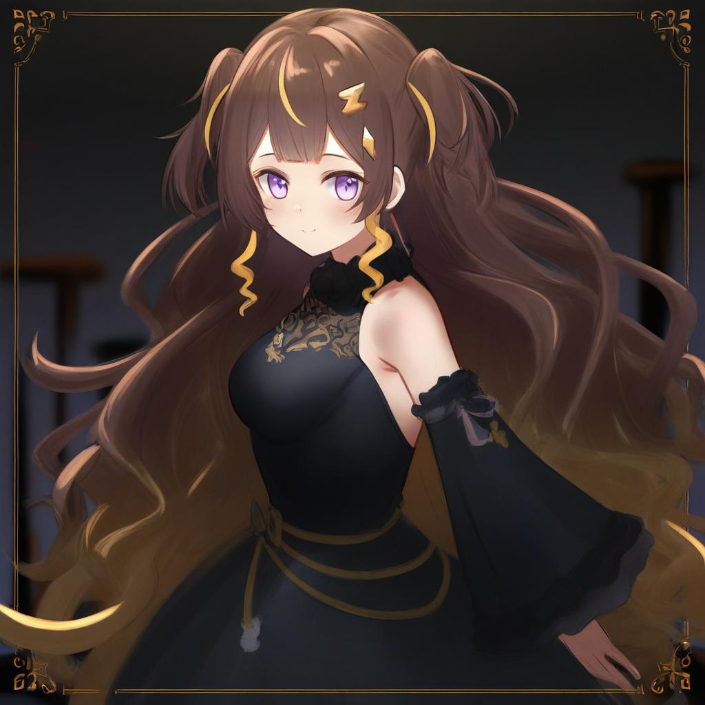 Anya melfissa, hololive, 1girl, purple eyes, brown hair, blonde hair, streaked hair, gradient hair, very long hair, long hair, two side up, hair ornament, medium breasts, black dress, detached sleeves, virtual youtuber, virtual youtuber, by artist doxy, leet