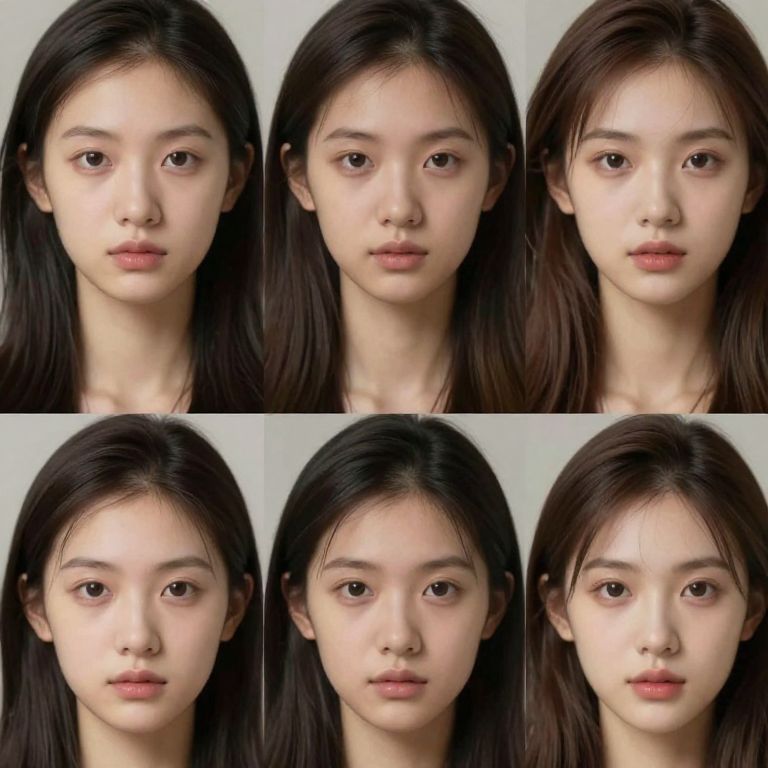 Stable diffusion visualization showing a series of consistent facial images, retaining identical facial structure and expression, photorealistic quality, balanced lighting with soft shadows, detailed hair and subtle background blur, digital art