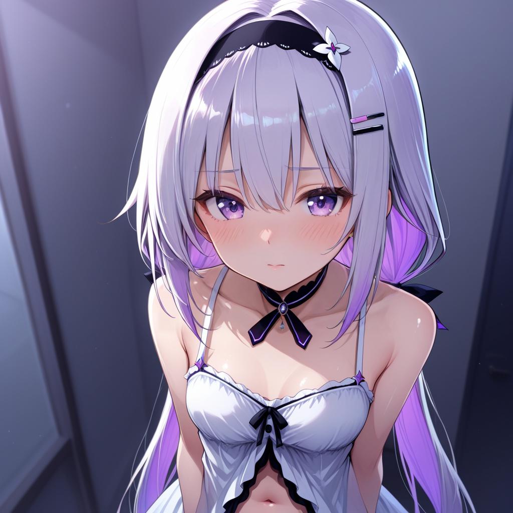 Carro pino, .live, 1girl, purple eyes, hair between eyes, purple hair, long hair, low twintails, small breasts, navel, virtual youtuber, virtual youtuber, headband, by artist chipa (arutana), dark_illustrious