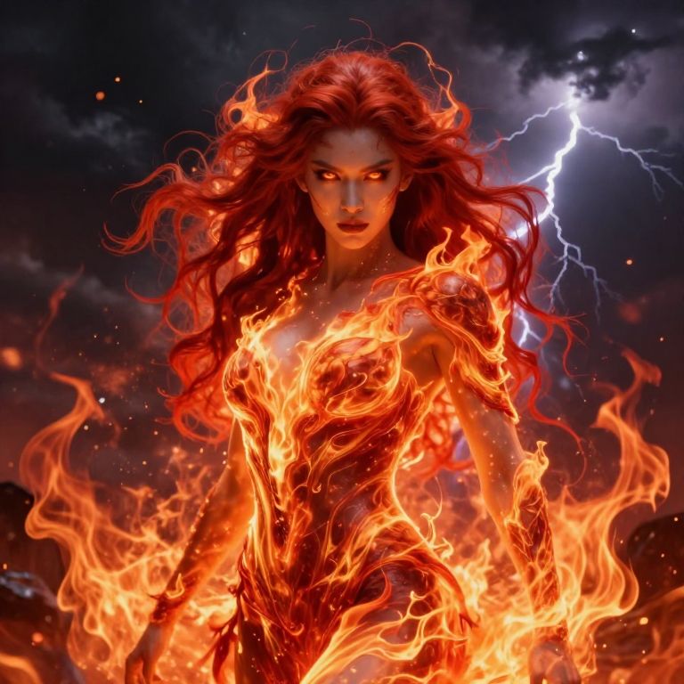 Digital artwork of a fierce, red-haired woman engulfed in fiery flames, with glowing red eyes and lightning in a dark, stormy sky background.