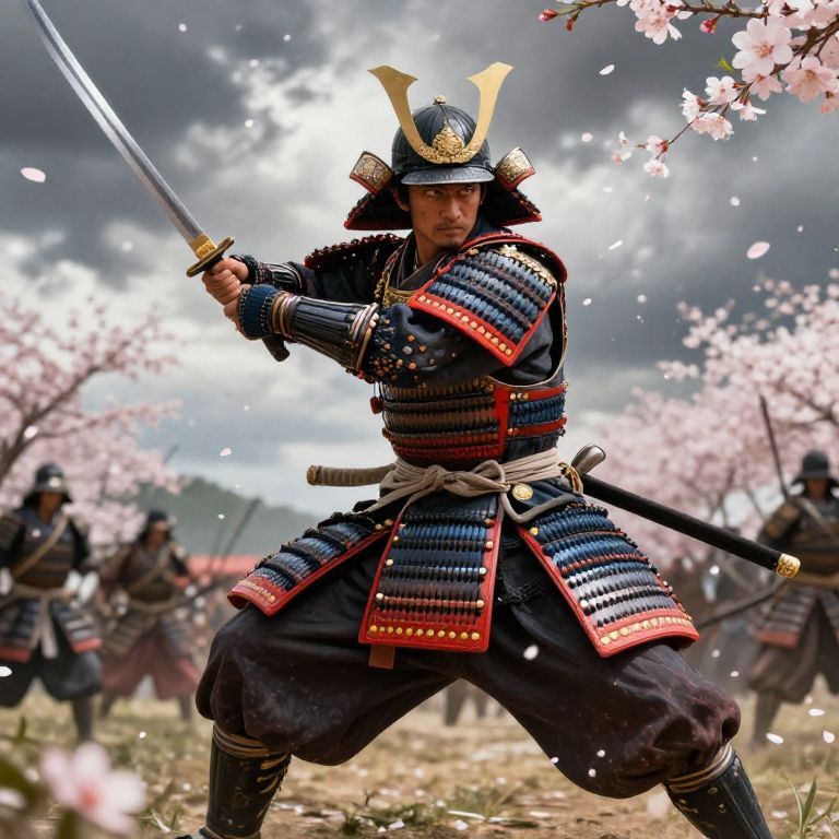 Mukoda portrayed as a samurai in a historical battlefield, detailed armor with crimson and gold accents, dynamic pose mid-swing with katana, swirling cherry blossom petals in the air, dramatic cloudy sky background