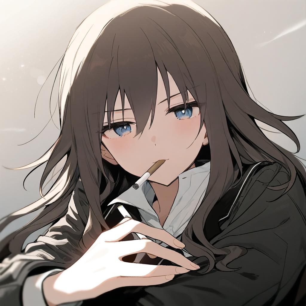 Digital illustration of an anime girl with long brown and black hair, striking blue eyes, and a cigarette in her mouth. The girl wears a black jacket over a white collared shirt. The lighting highlights her delicate facial features and her relaxed pose, captured in detailed anime art style.