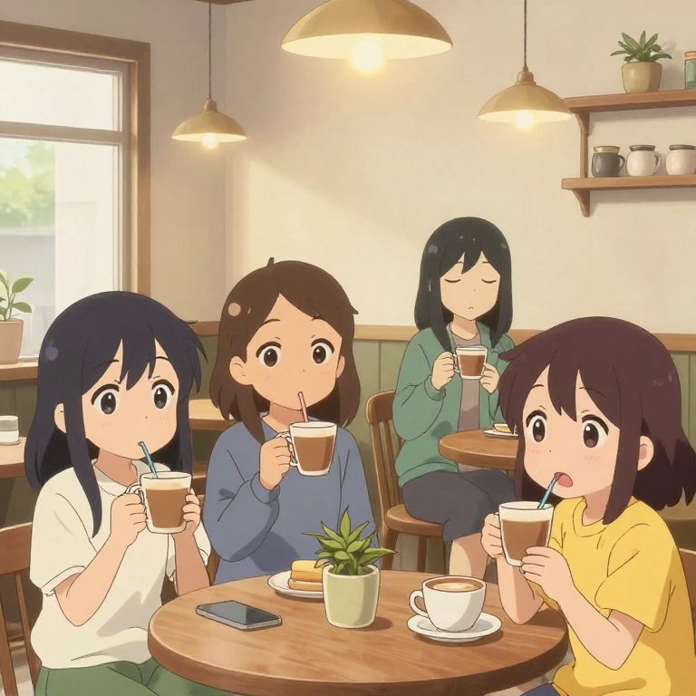 Convert to anime a cozy café setting with diverse characters enjoying coffee, warm atmosphere, detailed interior, expressive faces with large eyes, soft pastel colors, charming art style