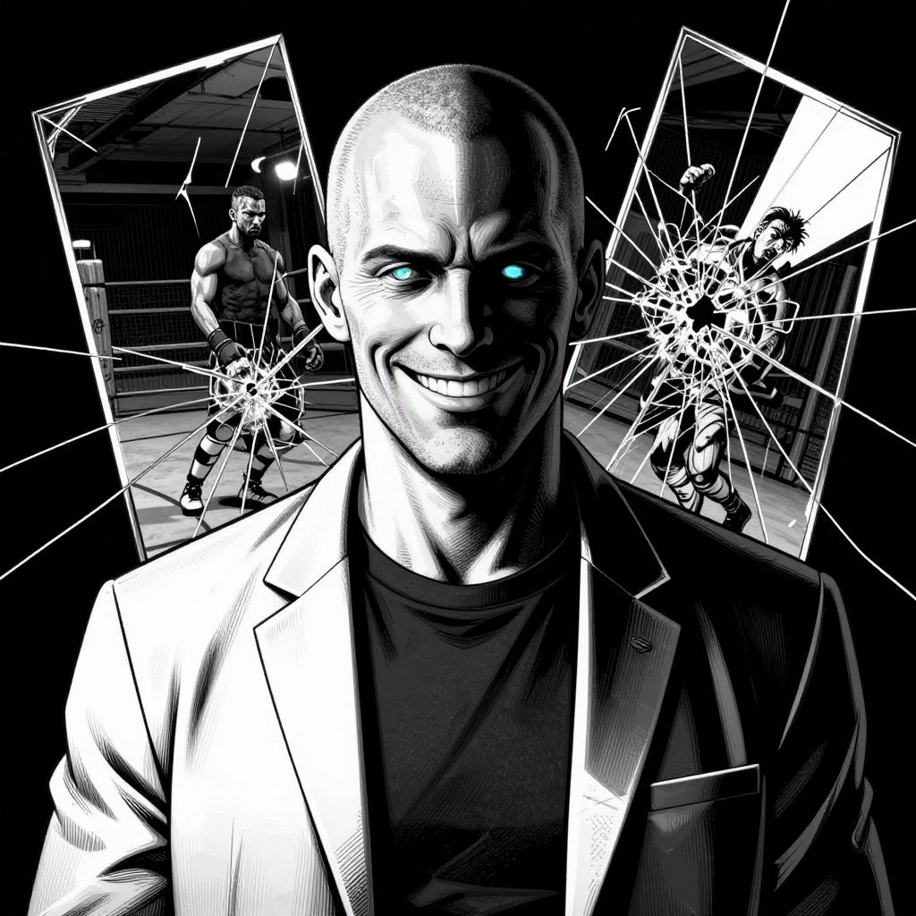 Tyler Durden character analysis depicted as a mysterious, charismatic man with a smirk, split between light and dark sides, with backgrounds of underground fight clubs and shattered mirrors reflecting psychological tension and societal defiance, in a high-contrast, graphic novel style.