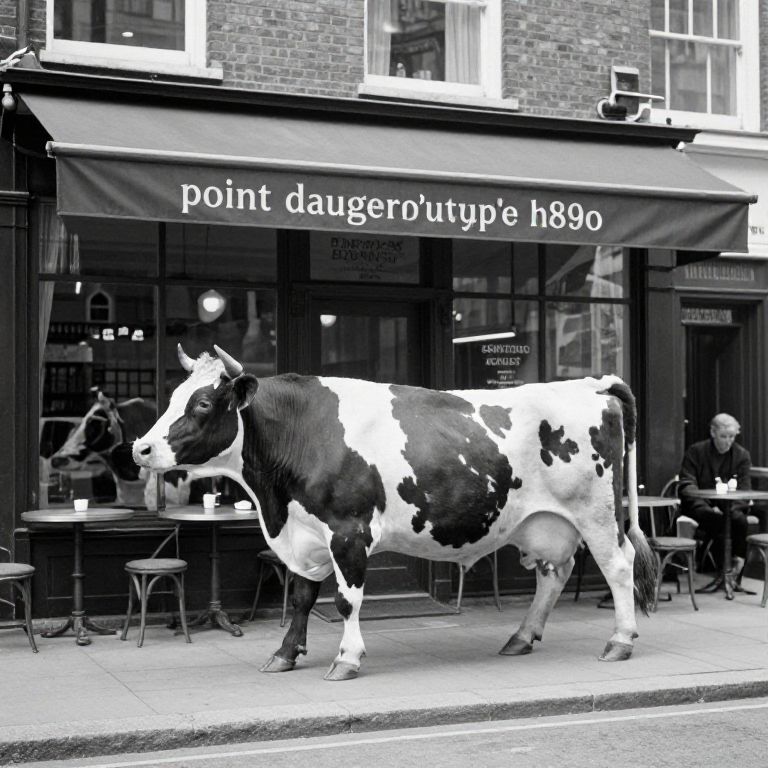 "Point daugerrotype photo BW a cafe in London 1890s, anthropomophic cow, anatomically correct, daytime, dynamic lighting, reality engine,"