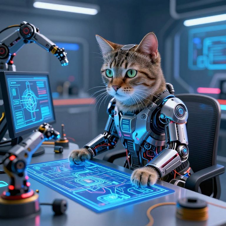 Engineeringcat sitting at a futuristic workbench, surrounded by holographic blueprints and robotic tools, sleek metal and glowing circuits, highly detailed cyberpunk aesthetic, neon lights reflecting on shiny surfaces, intense focus in cat’s eyes