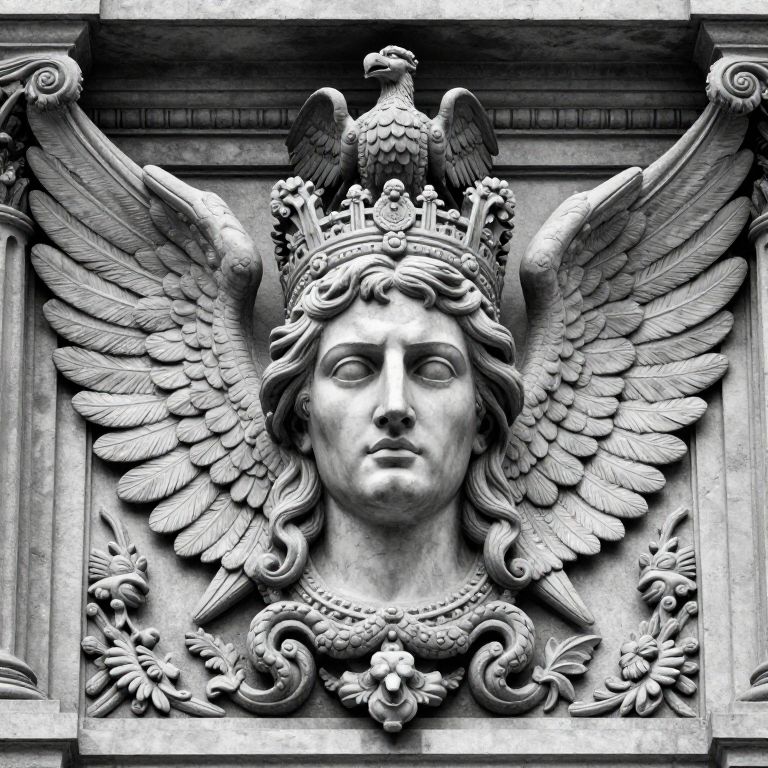 The image depicts a highly detailed, monochromatic sculpture of a man's face, likely representing a significant figure, set against an intricate, ornate background. The face is framed by a series of wings, evoking a sense of grandeur and power. The wings are intricately carved, with feathers and other decorative elements that add depth and texture to the scene. Above the face, there is an emblem or crest, featuring a central figure that appears to be a bird or eagle, further emphasizing the regal and authoritative nature of the sculpture. The background is rich with detailed carvings, including columns and other architectural elements, creating a sense of depth and complexity. The overall composition is balanced, with the face centrally positioned and the wings and background elements framing it, creating a cohesive and visually striking image.