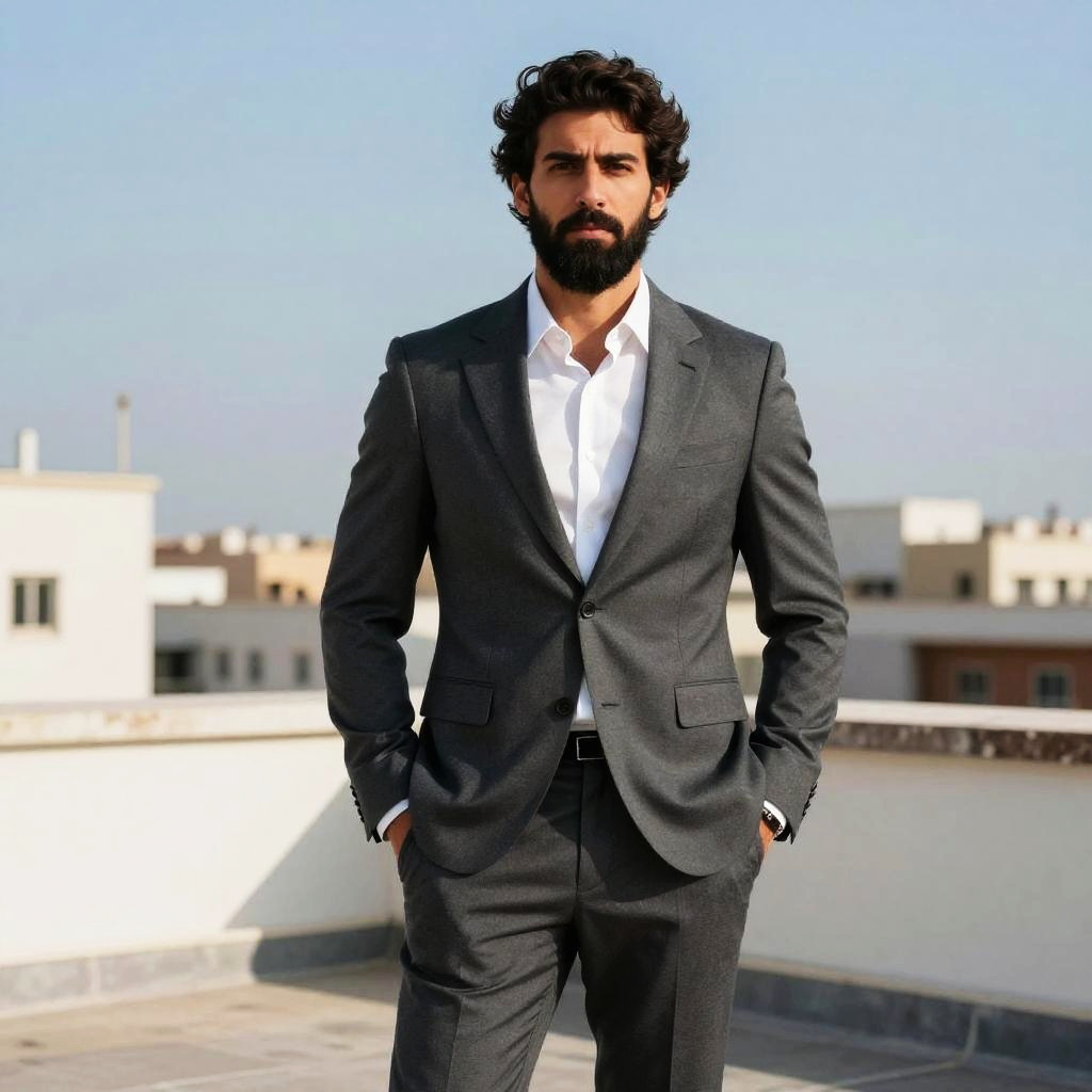 Photograph of a handsome, dark-haired, bearded man with a medium build, standing confidently on a rooftop. He is wearing a dark gray, well-fitted suit with a white dress shirt, and his hands are in his pockets. The rooftop has white, flat-roofed buildings in the background under a clear, blue sky. The man has a serious expression and is centered in the frame. The bright sunlight casts soft shadows, enhancing the sharpness of his suit's texture. The overall atmosphere is modern and professional.