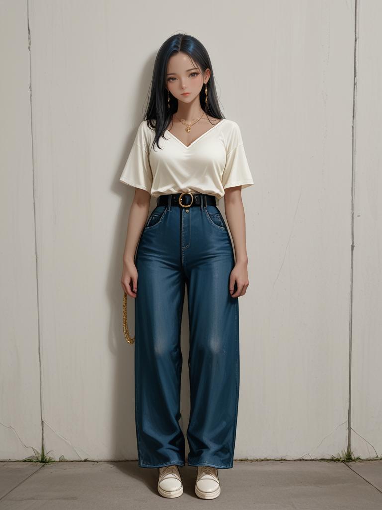 1girl, realistic face, full body shot, Woman, casual, fitted beige scoop-neck t-shirt, short sleeves, thin gold necklace, high-waisted dark blue jeans, prominent black belt, large square buckle, plain white wall background.