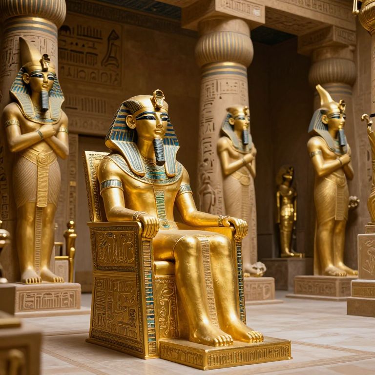 Egyptian pharaoh's throne room interior with golden statues, ornate columns with detailed hieroglyphics, grand chair made of gold and precious stones, soft ambient light highlighting the luxury and power, cinematic and majestic atmosphere