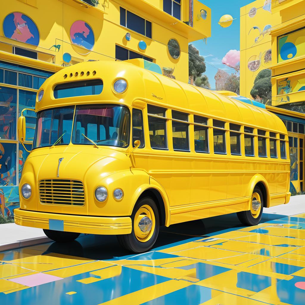 A shiny yellow school bus, no people, styled by James Jean, with vibrant colors and comic cover art influences.