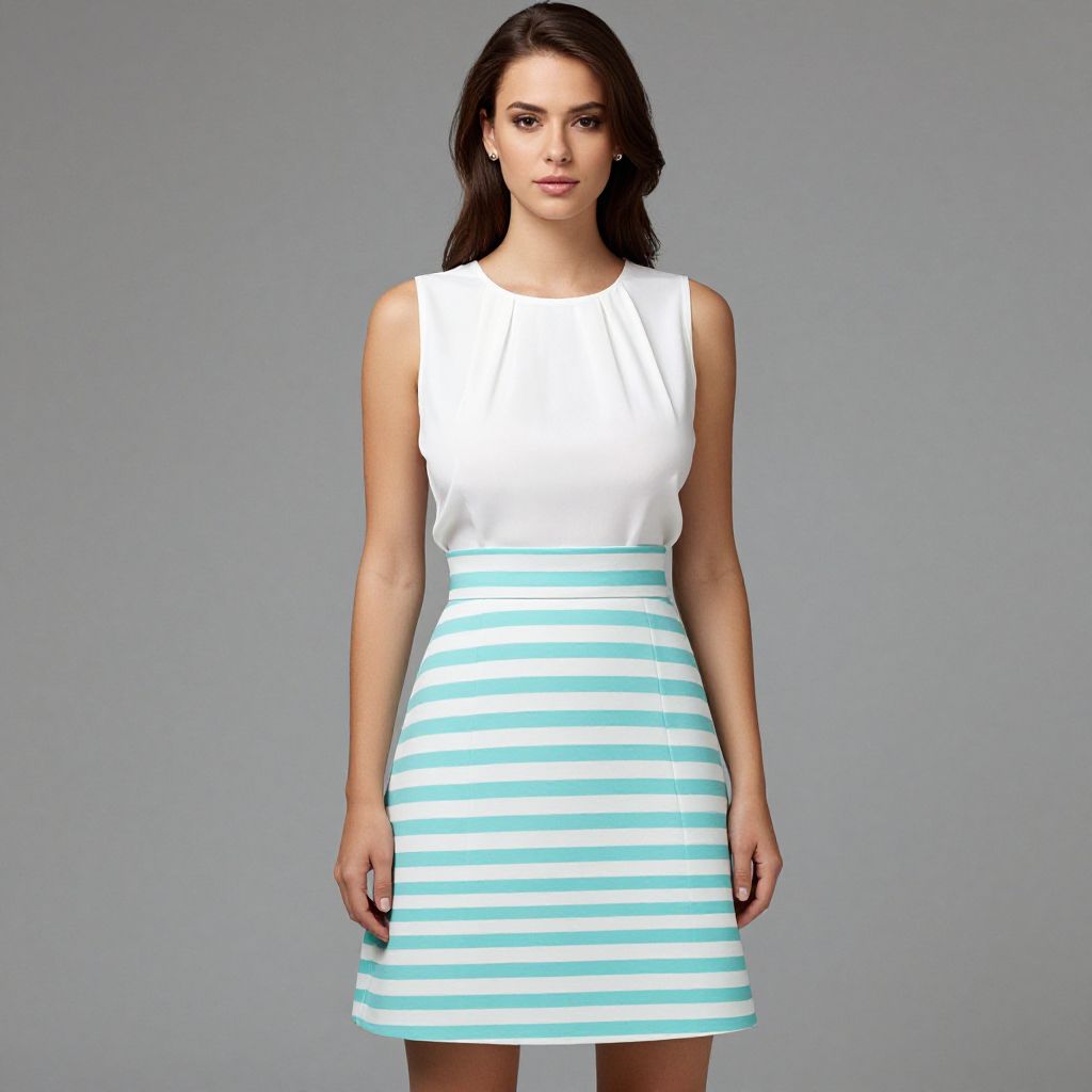 "Woman, chic, sleeveless white blouse with a rounded neckline, paired with a high-waisted A-line skirt, horizontal aqua and white stripes, knee-length, minimal jewelry with stud earrings.. Sexy. Pretty face and beаutiful eyes. Big breasts."