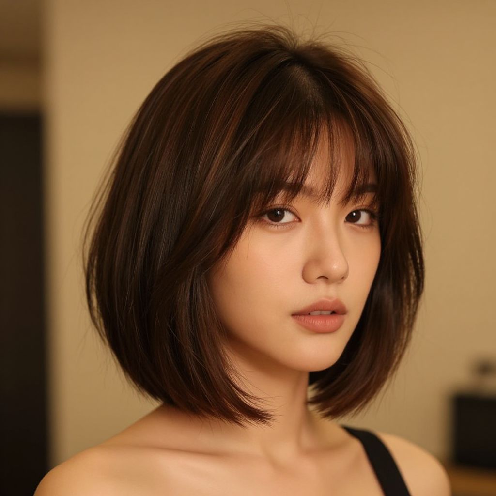 Woman with asymmetrical bob hairstyle, contemporary and artistic, one side cut shorter and uneven, the other gently swept, creating balance through asymmetry; highlights and depth in hair texture, strong oval face frame, natural pose with slight head tilt, ambient indoor lighting, warm tones, medium shot, soft shadows, professional portrait style, realistic and vivid details.