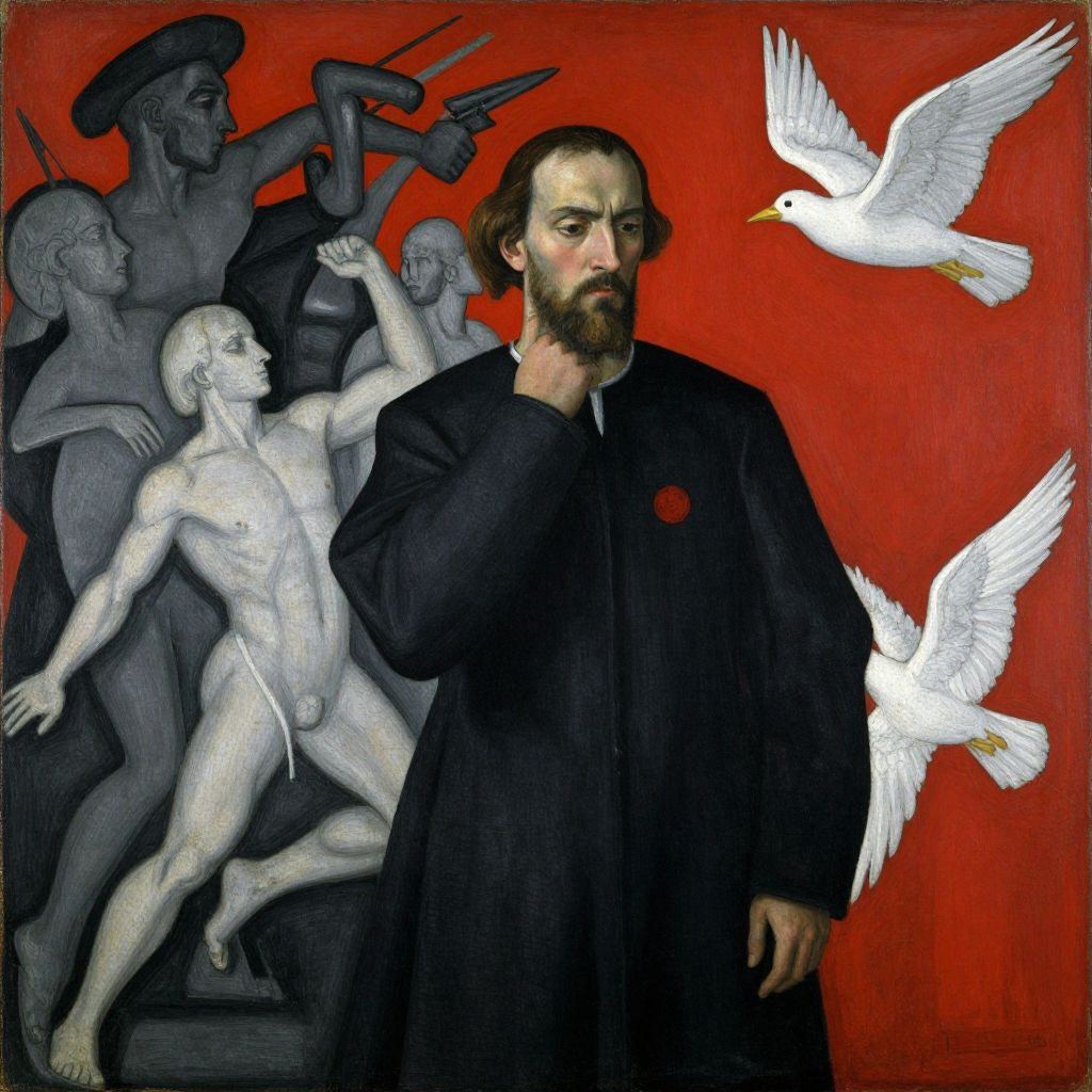 This is a digital image of a painting in a realistic style featuring a bearded man with a serious expression, wearing a black robe with a red dot on the left side of his chest. He stands in the foreground against a vivid red background. Behind him, there are gray, sculpted figures in dynamic poses, including a nude male figure with a long sword and a soldier with a helmet. Two white doves with outstretched wings fly to the right of the man. The contrasting colors and textures create a dramatic, symbolic composition.
