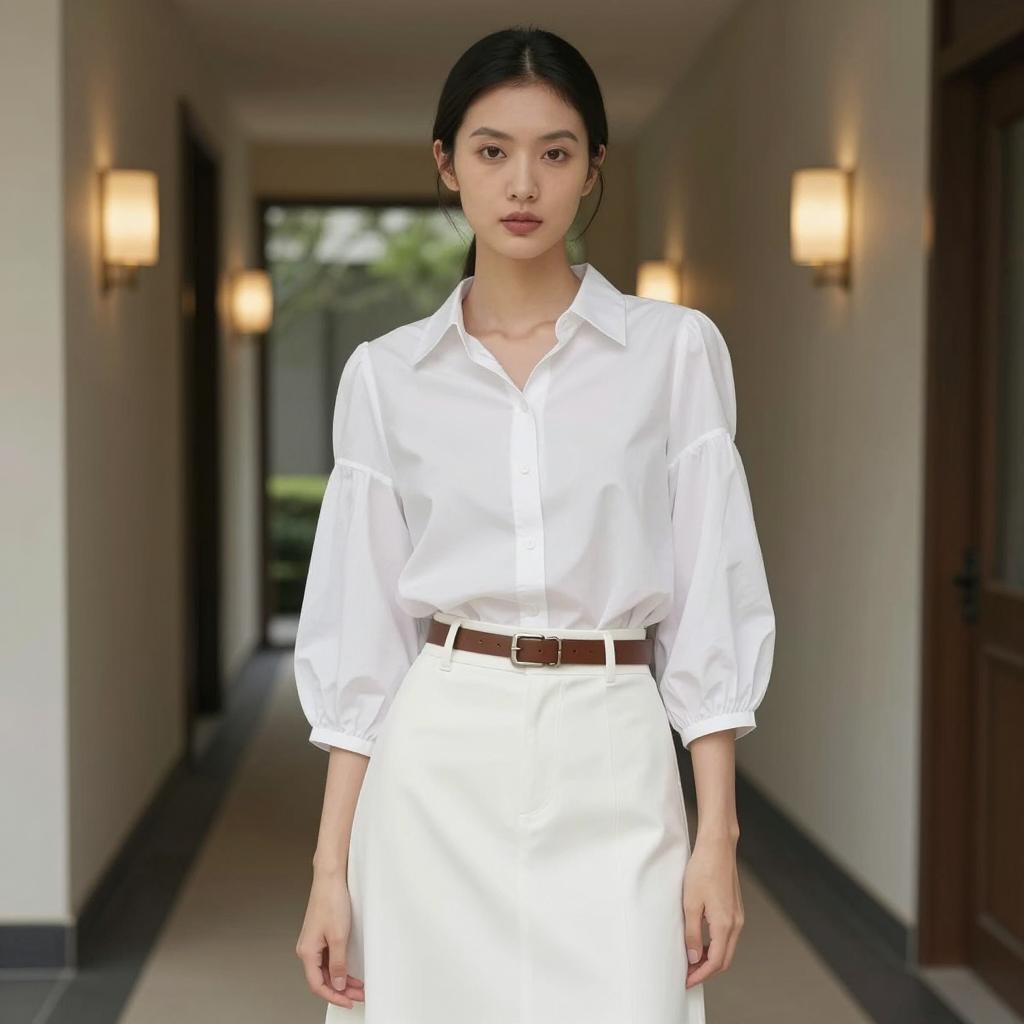 Black-haired woman with pale skin, wearing a black blouse, standing in front of an ornate, oval, silver-framed mirror. She gazes at the mirror with a serious expression, left hand touching her chest. The mirror is decorated with floral patterns and set against a dark, ured background. Reflection shows her upper body and face. Two smaller, similarly ornate mirrors are in the background.