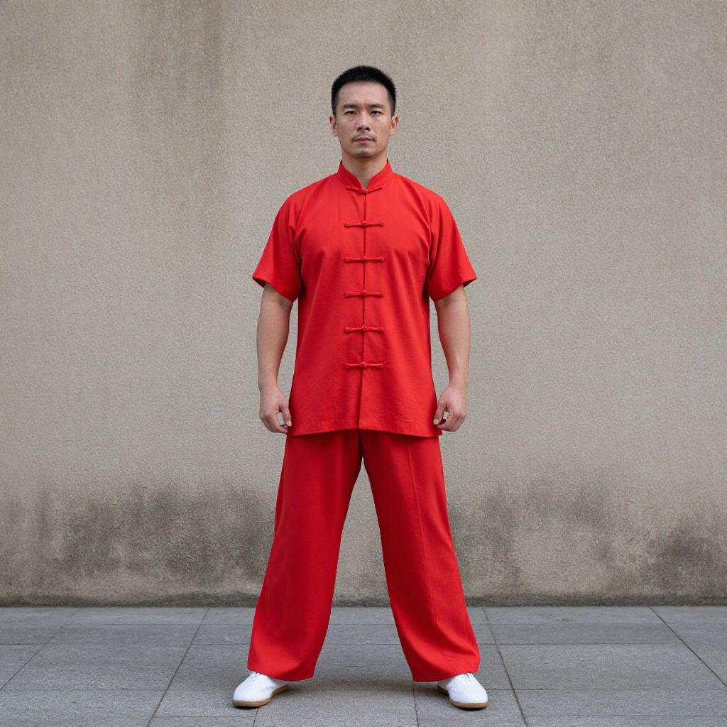 "Wushu Tao, man in a red chinese costume standing in front of a wall"