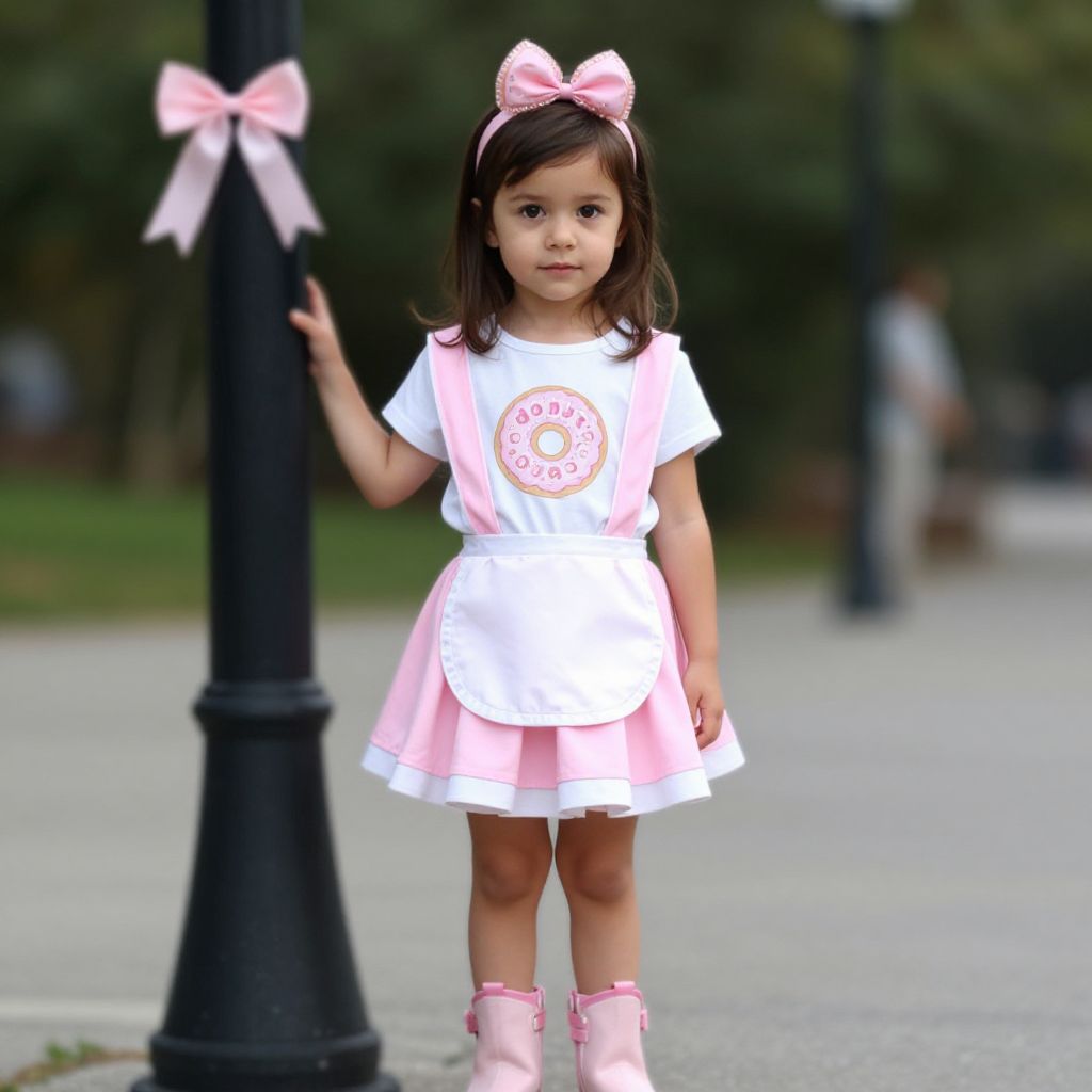 "donut waitress toddler, solo, 1girl, outdoors, bow, lamppost, dress, hairband, blurry, boots, blurry background, looking at viewer, brown hair, pink skirt, realistic, standing, tree, shirt Realistic photo of casual sexy person with pretty face"