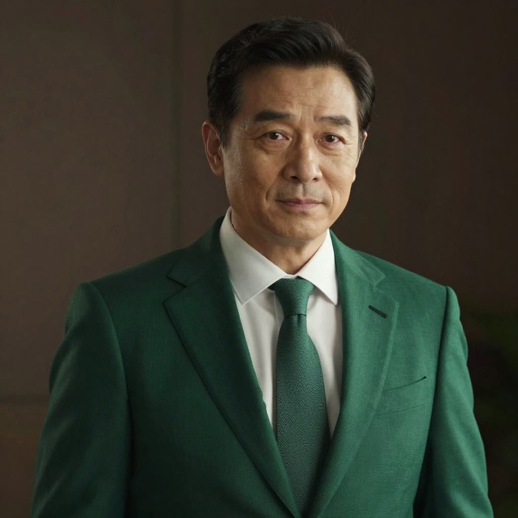 Realistic photo.Hyper-detailed portrait of a beautiful middle-aged man with emerald green, dressed in professional suit, glowing under cinematic lighting. realistic photo