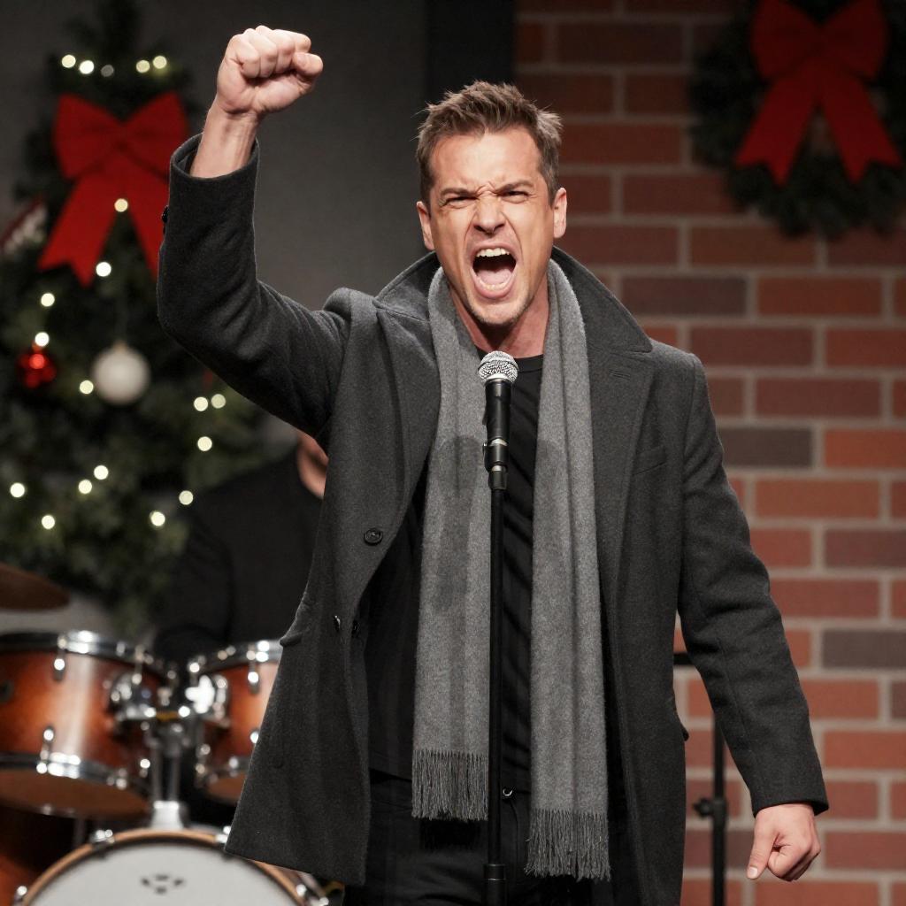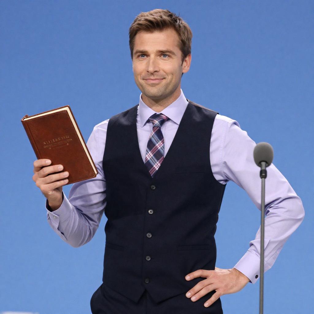 Photograph of a smiling man with short blonde hair, wearing a purple dress shirt and plaid tie, standing at a microphone, holding his right hand near his chest. Two men in the background, one playing an acoustic guitar, one seated. Purple and blue screen behind them. Microphone stand and cable visible.