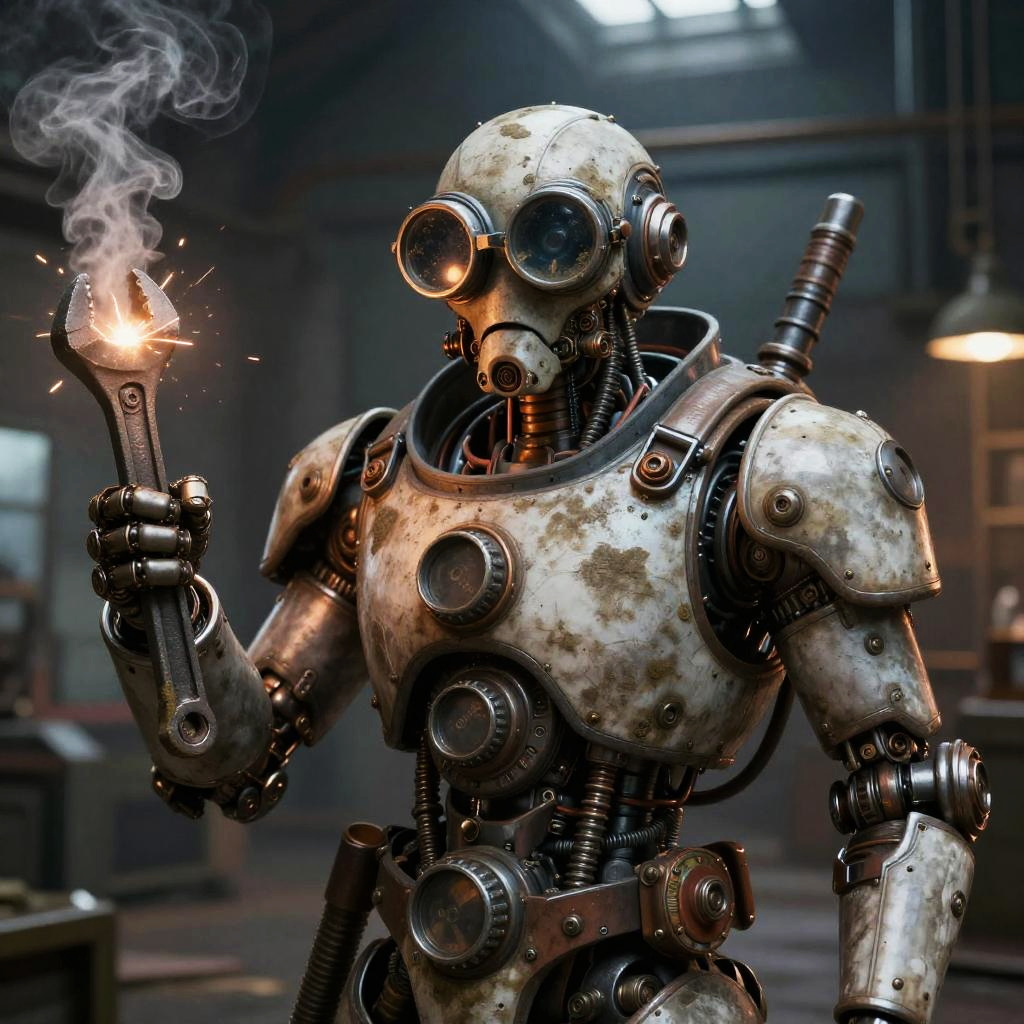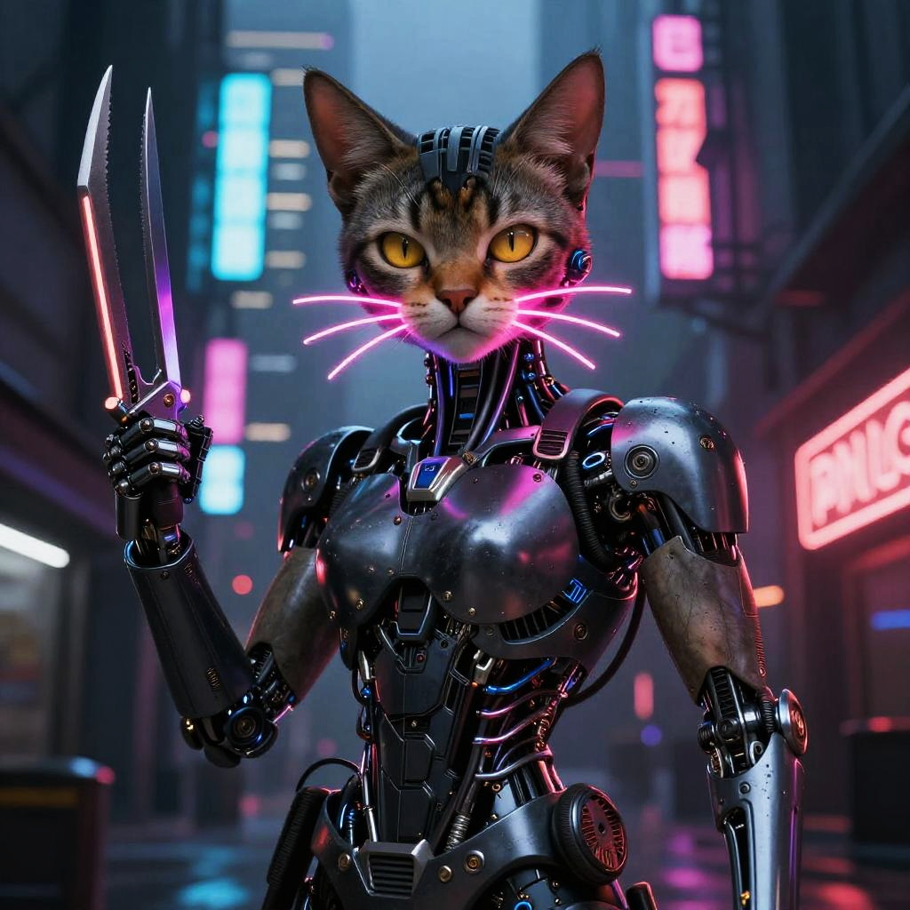 Cybernetic cat with yellow eyes and sharp claws, holding a blade in a neon-lit, futuristic city street at night. Photorealistic