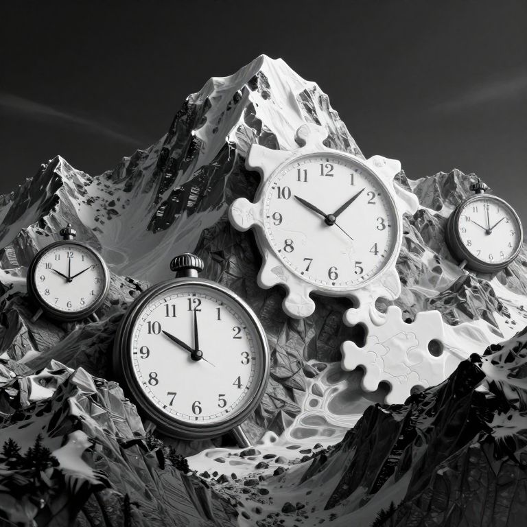 A mountain range composed entirely of clocks ticks backward, its peaks melting into abstract puzzles that rearrange themselves at midnight.