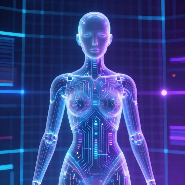 Flat chested AI hologram figure, translucent with circuit patterns visible beneath the surface, standing inside a glowing digital grid, blue and purple hues dominant, cyberpunk ambiance with light flares and tech motifs.