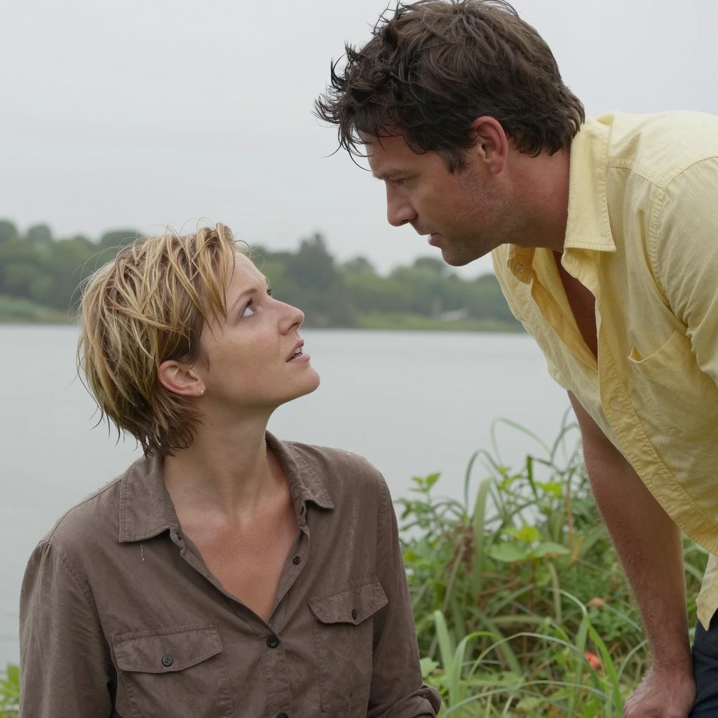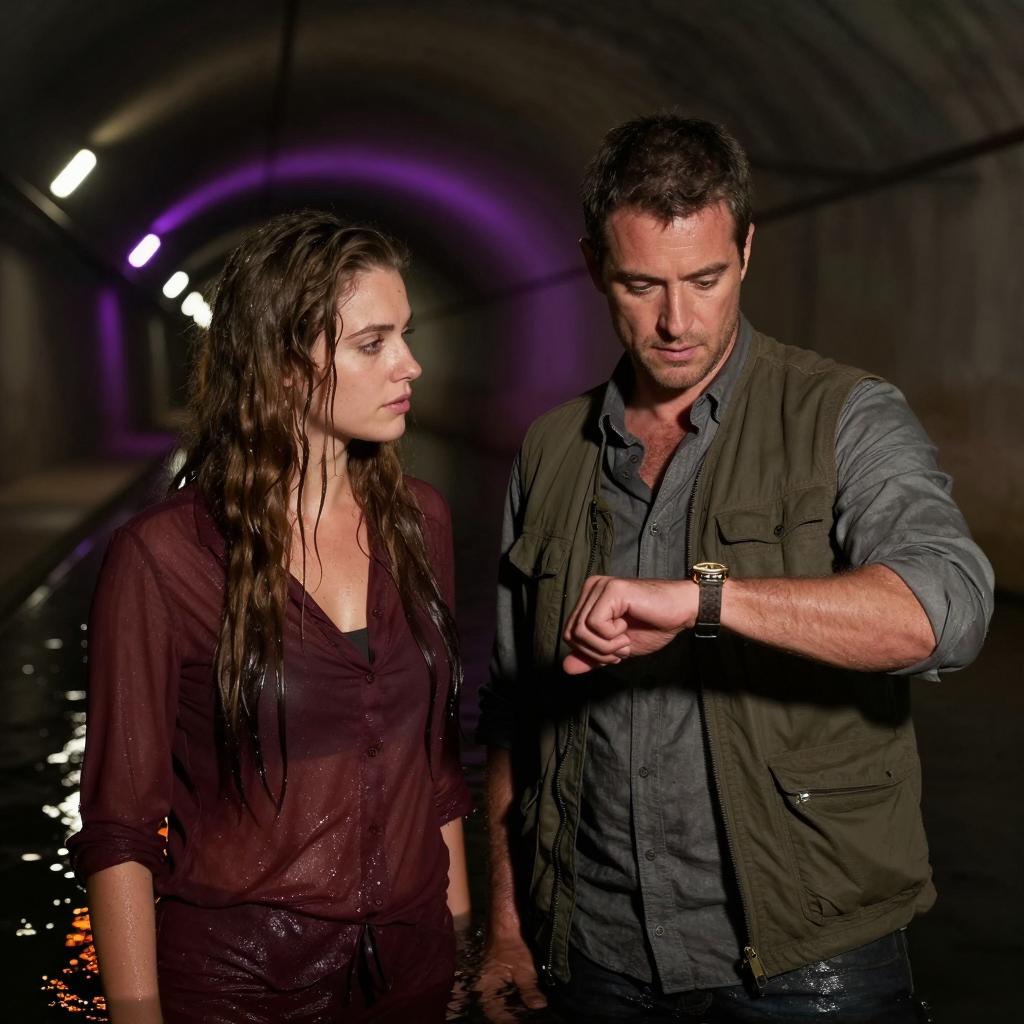 A man and woman standing close in a dimly lit, water-filled tunnel. Man has short dark hair, green vest over gray shirt, watches on left wrist, intense expression. Woman has long wet brown hair, maroon shirt, looks at man. Water reflects orange and purple lights. Both hands resting on tunnel edge. Tunnel has arched ceiling and illuminated spots.