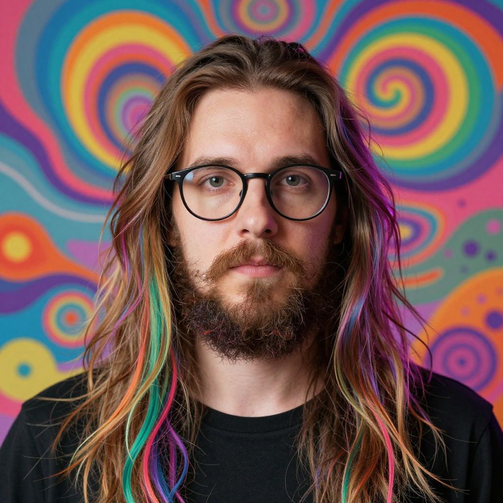 Photograph of a bearded man with long, rainbow-colored hair, black glasses, and black shirt, against a vibrant, psychedelic swirl background.