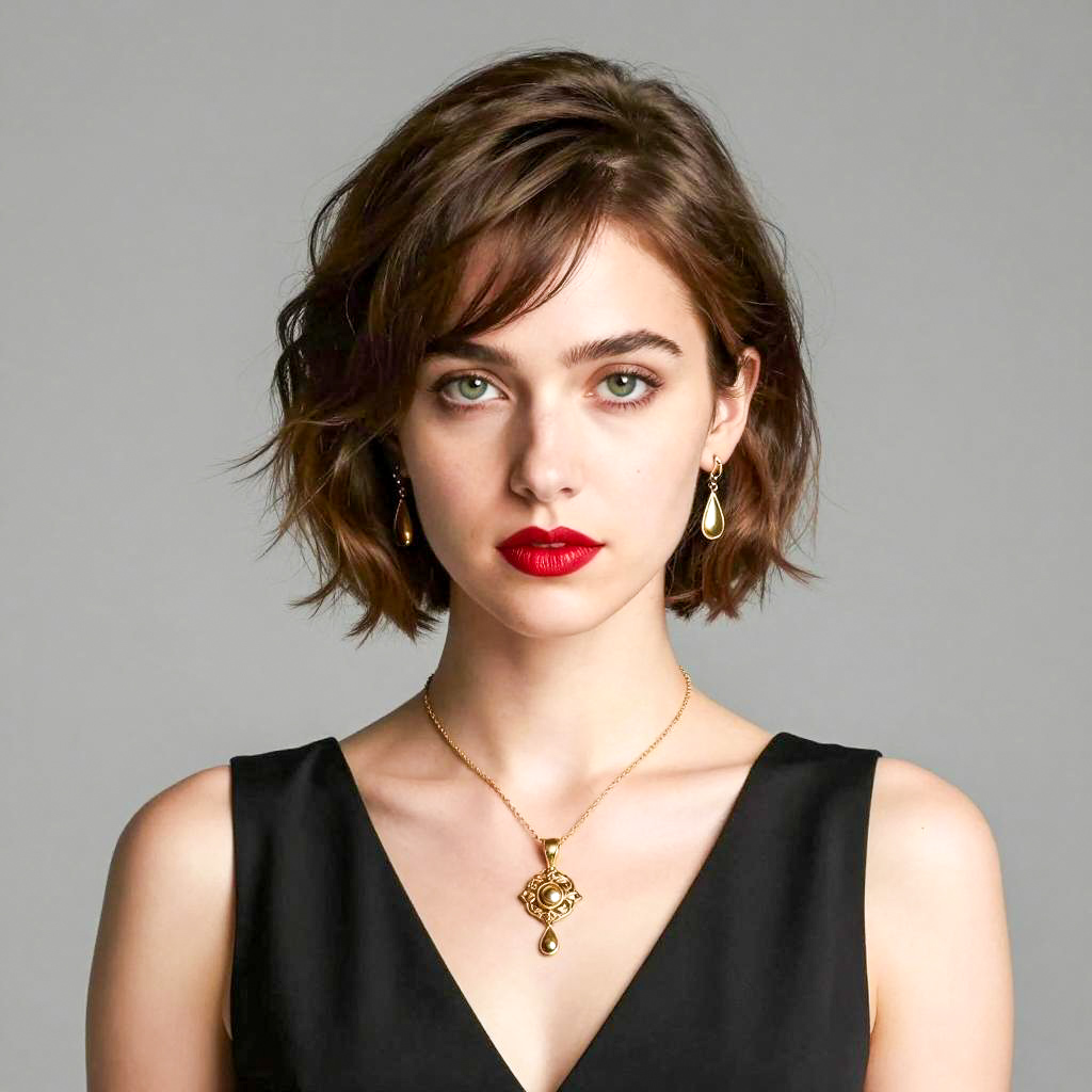 Photograph of a young woman with short, blonde bob haircut, light skin, green eyes, and red lipstick. She wears a sleeveless red turtleneck and gold rectangular earrings. She gazes slightly to the right with a neutral expression. Background is a dark green blur.