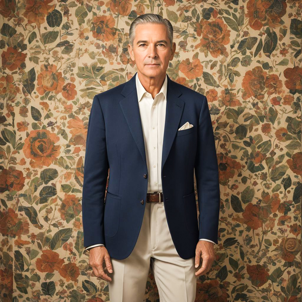 Portrait of a slender older man with short slicked-back grey hair wearing a navy blue blazer, white dress shirt, striped tie, and matching dress pants. He stands confidently in front of a vintage-style floral woven tapestry background, evoking a nostalgic 2014 throwback fashion vibe. The man accessorizes with a watch and white pocket square, presenting a classic, polished look.