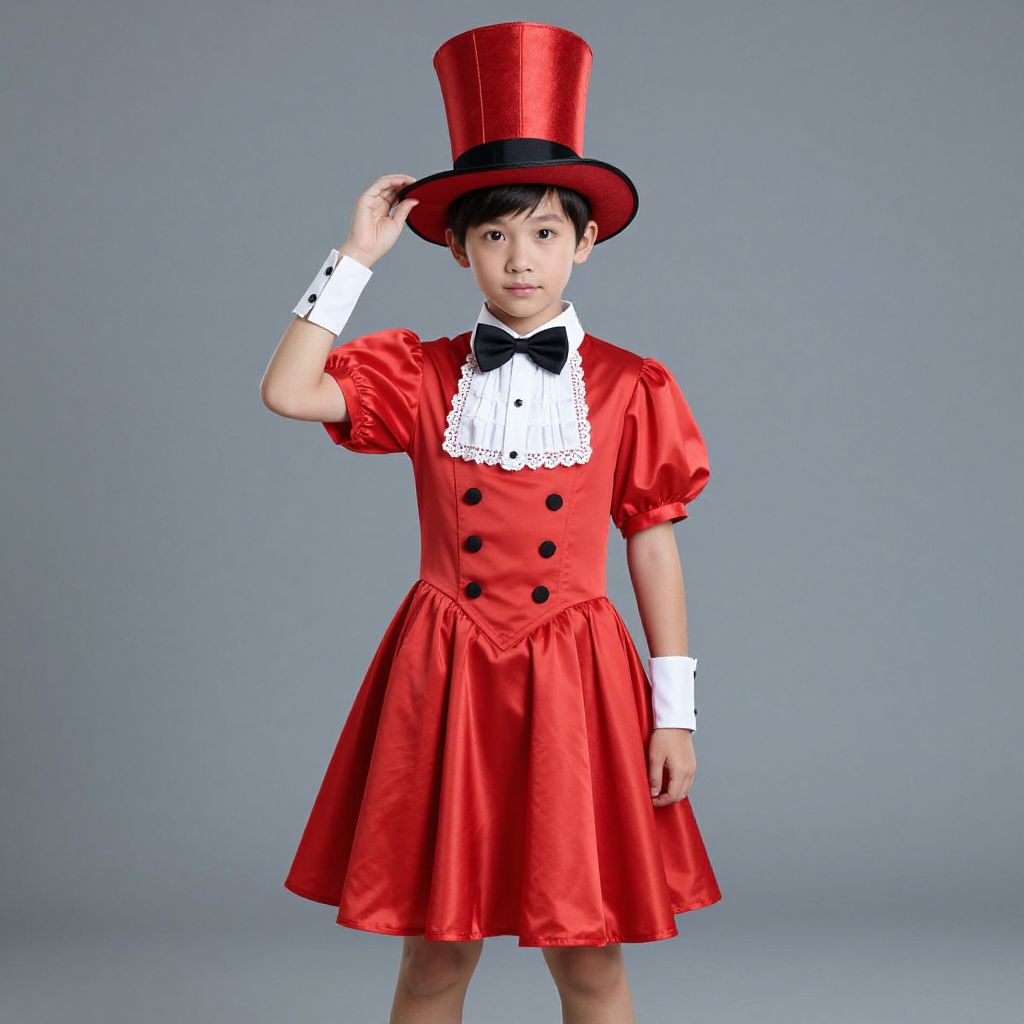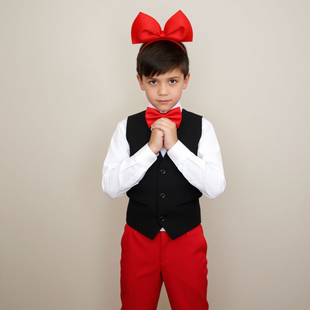 "dressy halloween costume boy, 1boy, male focus, solo, red pants, bow, hat, bowtie, vest, pants, white shirt, shirt, black vest, red bow, looking at viewer, red bowtie, own hands together, closed mouth Realistic photo of casual sexy person with pretty face"