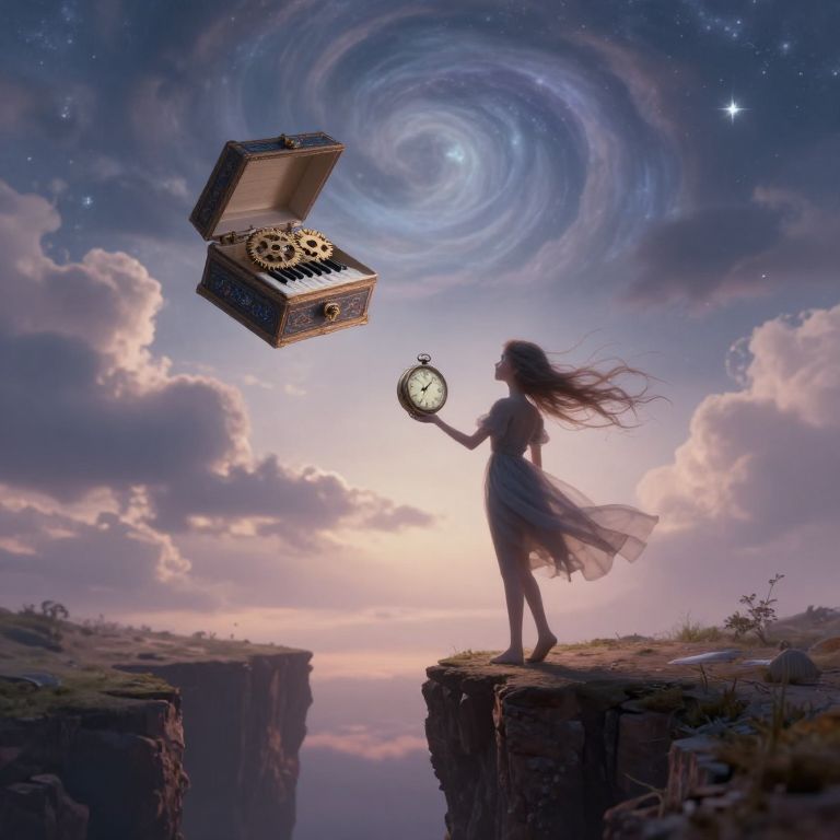 Craft an enigmatic scene in the vein of surrealism, where a fragile young maiden with flowing, ethereal hair stands at the edge of a vast chasm, her back towards the observer. She holds a vintage timepiece in one hand, its gears frozen in an eternal pause. Before her, an ornate music box floats mysteriously in mid-air, its keys gleaming like precious gems. The sky above is painted with swirling clouds and a majestic star, casting an otherworldly glow over the scene. Employ soft, diffused lighting to evoke a dreamlike atmosphere, highlighting the maiden's silhouette against the dynamic backdrop. This mesmerizing image should invoke feelings of wonderment, curiosity, and a touch of melancholy, enticing viewers to delve into the mystery enveloping this supernatural tableau.
