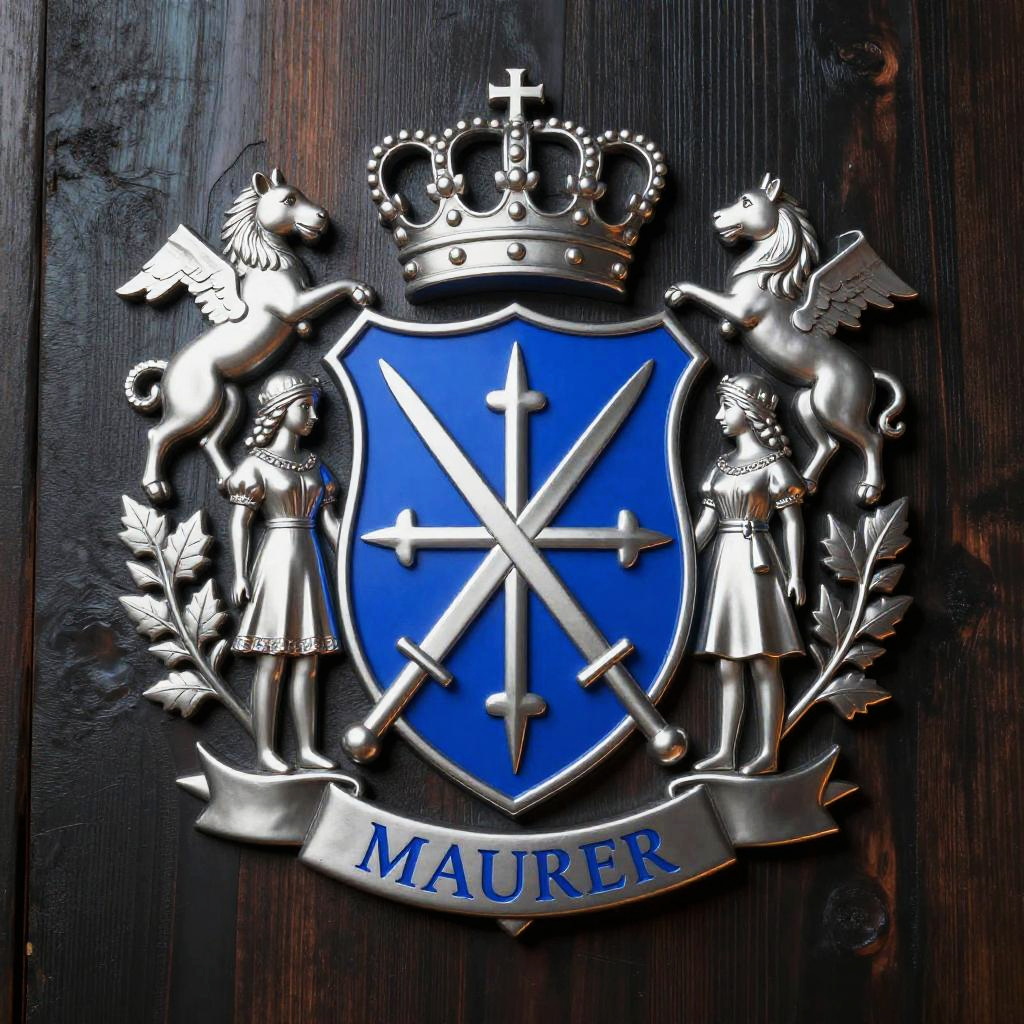 Maurer family crest, metallic 3D embossed emblem on dark wood, shining silver and royal blue elements with a crown and crossed swords, cinematic lighting