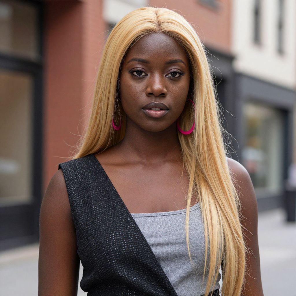 Dark skin women with blonde hair standing in a vibrant urban setting, wearing modern fashion with bold accessories, soft natural lighting highlighting the contrast between skin and hair, detailed textures on fabric and hair strands, realistic style.