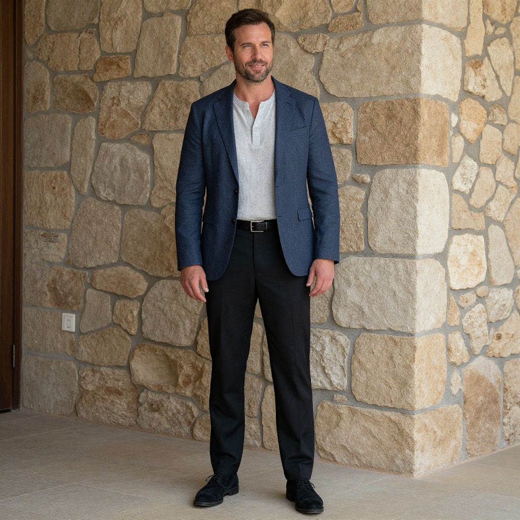 A man, light gray linen Henley shirt, dark blue cotton blazer, tailored black dress pants, black suede derby shoes, sleek black leather belt, rustic stone winery, soft natural light, relaxed smile, confident demeanor. Man has masculine face and piercing eyes