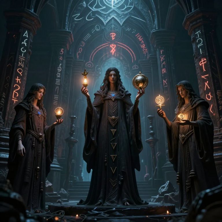 Deitys illustrated in a dark gothic environment, shadowy temples with haunting glowing runes, figures cloaked in mysterious robes holding ancient artifacts, surreal and atmospheric, deep contrasting shadows and vibrant highlights, cinematic fantasy vibe with intricate gothic details